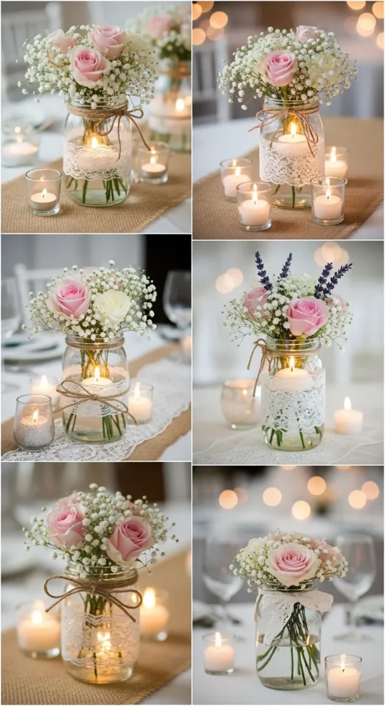 Transform simple Dollar Tree vases and candle holders into jaw-dropping centerpieces. Mix glass jars, faux flowers, and LED candles to create a romantic glow for your tables. Add a touch of metallic paint or ribbon for a sophisticated finish. These affordable pieces can be customized to match your wedding theme, whether rustic chic or classic elegance.