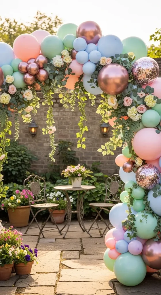 Welcome guests with a pastel balloon arch over your patio or front doorway. Opt for a mix of soft pinks, lilacs, creams, and light blues. For a high-end touch, mix in metallic gold and rose-gold balloons. Add cascading greenery or delicate silk flowers between the balloons to enhance texture and luxury appeal.