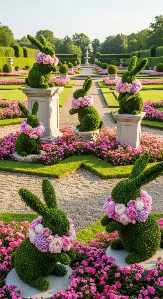 Give your outdoor space a playful yet refined twist with bunny-shaped topiaries. Using boxwood or artificial greenery, shape your topiary into cute bunny silhouettes. Position them on either side of your entrance or garden corners, and add floral collars in soft pinks, whites, and lilacs. These charming sculptures create a memorable, luxury Easter statement.