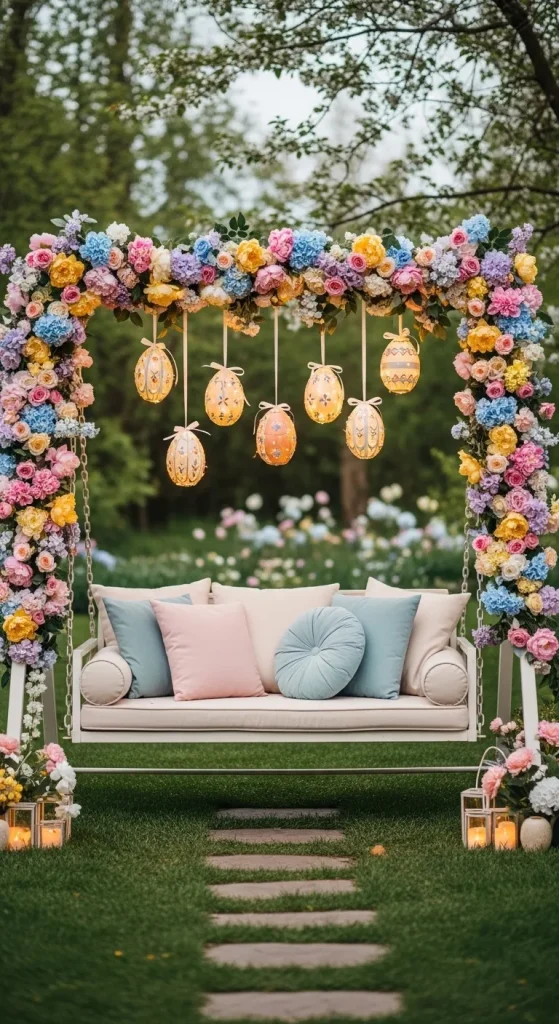 For a truly enchanting touch, decorate an outdoor swing or seating nook with Easter charm. Adorn it with pastel floral garlands, soft cushions in elegant fabrics, and hanging decorative eggs. Add a small fairy light canopy for evening sparkle. This creates a cozy yet luxurious corner for relaxation and photo-worthy moments.