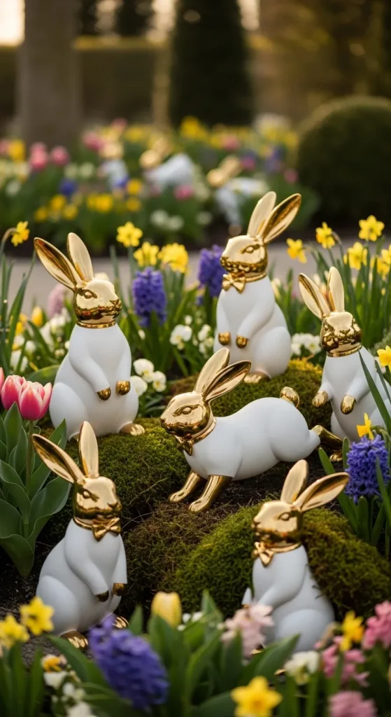 Craft a chic, high-end Easter bunny scene using sculptural pieces instead of typical plush toys. Choose sleek white ceramic bunnies, gilded bronze bunnies, or minimalist stone designs. Position them among blooming flower beds or atop marble garden pedestals. Add accents of fresh flowers or moss for a delicate, whimsical finish.