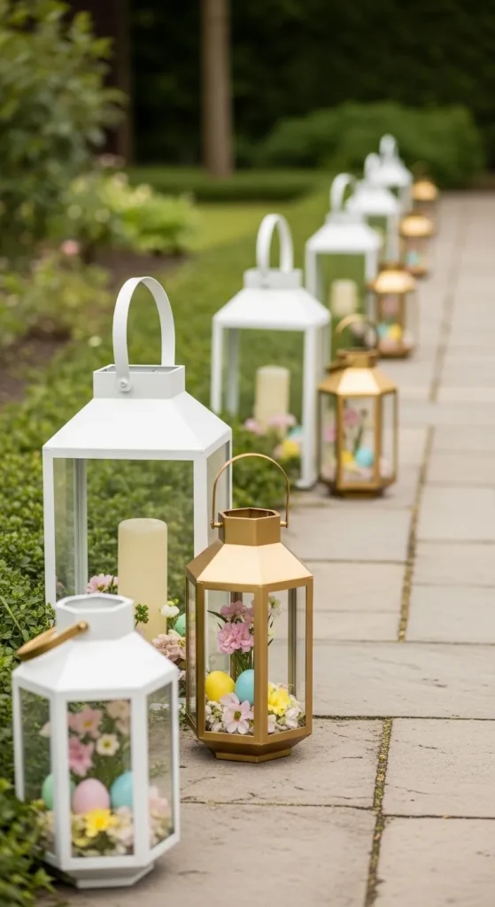 Enhance your Easter evenings with elegant outdoor lanterns. Opt for lanterns in matte white, gold, or copper finishes, and fill them with pastel eggs, faux moss, or seasonal florals. Arrange them along pathways, stairs, or seating areas to create a warm and inviting glow. This subtle luxury detail transforms your outdoor space into a magical retreat.