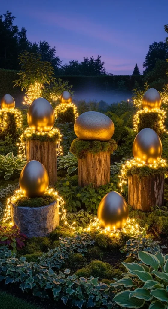 Design an eye-catching outdoor Easter display featuring golden eggs. Place a selection of large metallic gold eggs on pedestals or nestled in low greenery beds. Add small fairy lights or candles around the base for a glowing, ethereal effect. This decor idea exudes opulence and will impress any guest.