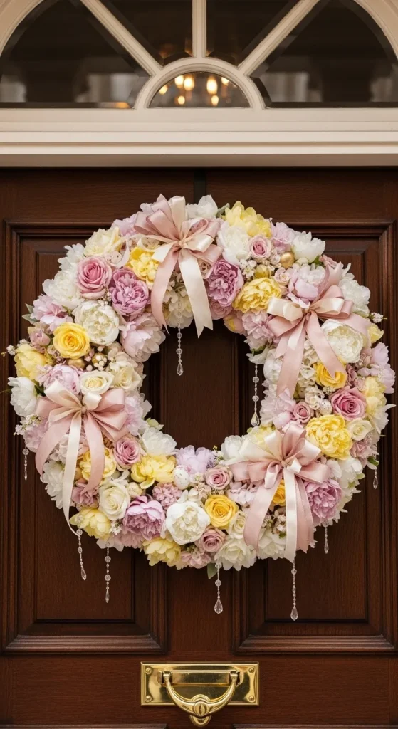 Elevate your outdoor entrance with luxury Easter wreaths crafted from fresh spring flowers, greenery, and elegant embellishments. Incorporate soft-colored roses, peonies, and orchids with delicate silk ribbons. For an upscale look, add small gold accents or crystal drops to catch the sunlight and create a glimmering effect.