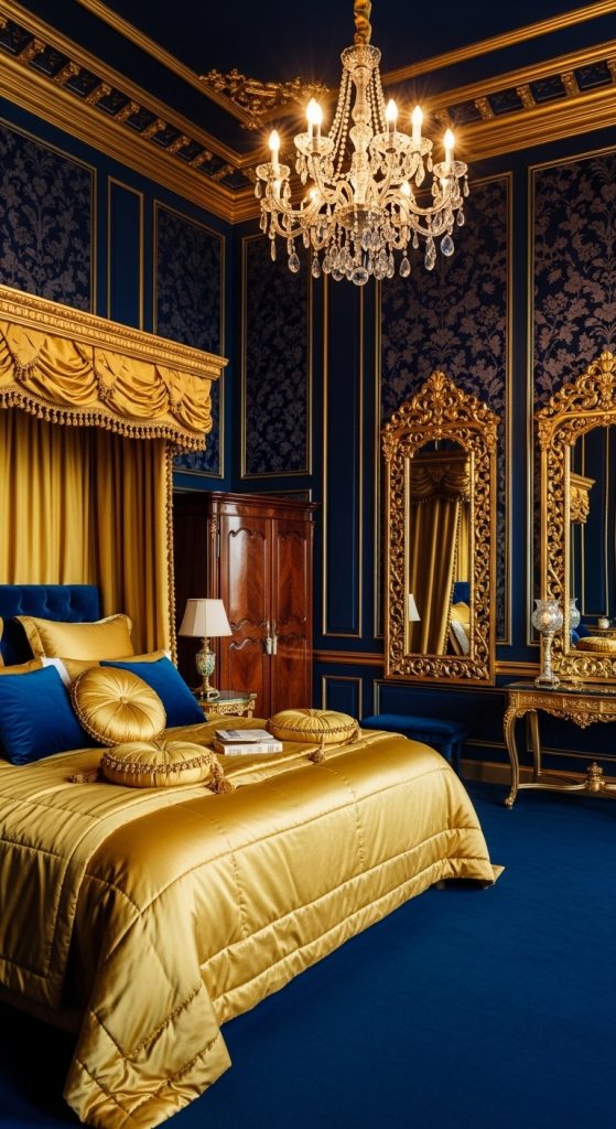 Create a regal atmosphere by pairing deep navy blue walls with golden yellow bedding and luxurious drapery. Accent with velvet cushions, ornate mirrors, and a statement chandelier for a sophisticated and glamorous touch that exudes elegance.