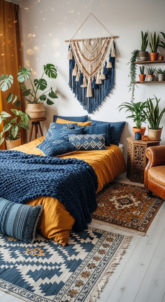 Infuse your master bedroom with boho charm using a mix of indigo and mustard tones. Layer patterned textiles, eclectic cushions, and wall tapestries. Incorporate plants, macrame decor, and woven rugs to give a creative and cozy vibe while keeping the yellow and blue theme consistent.