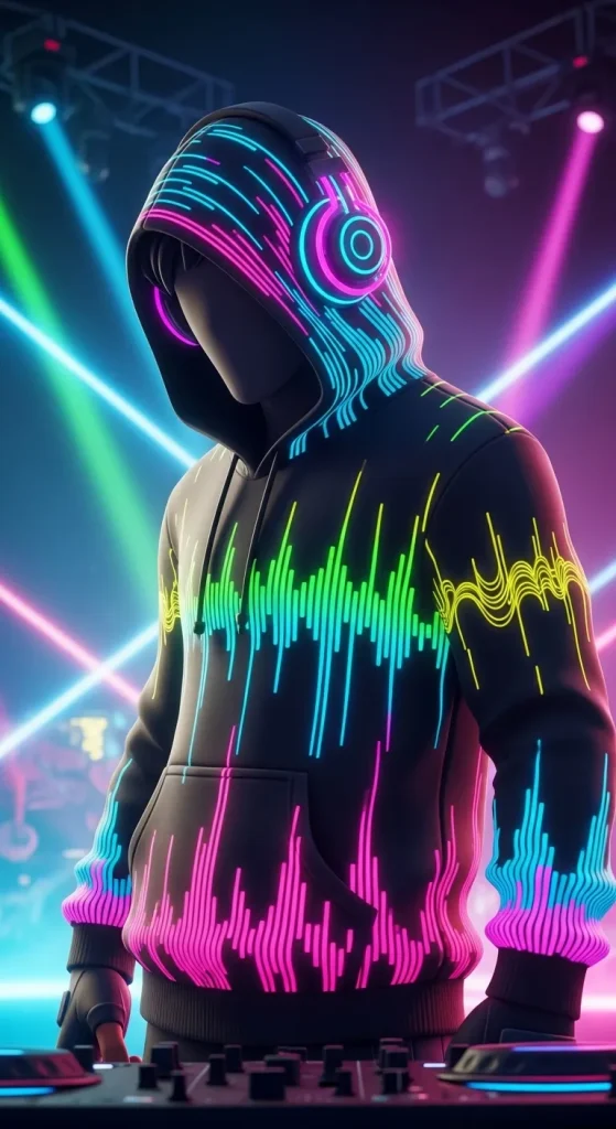 The character carries a portable DJ controller attached to their belt, and glowing headphones rest around their neck. Every detail reflects the vibe of a late-night rooftop party where music never stops.