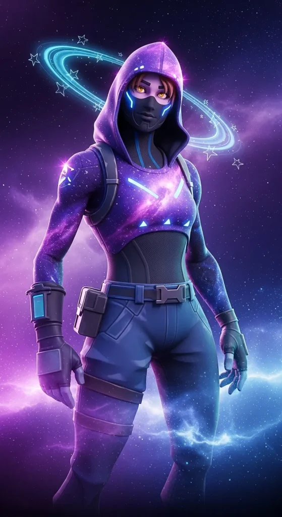 Purple and blue cosmic colors dominate the design, while neon accents highlight important details like gloves and boots.
