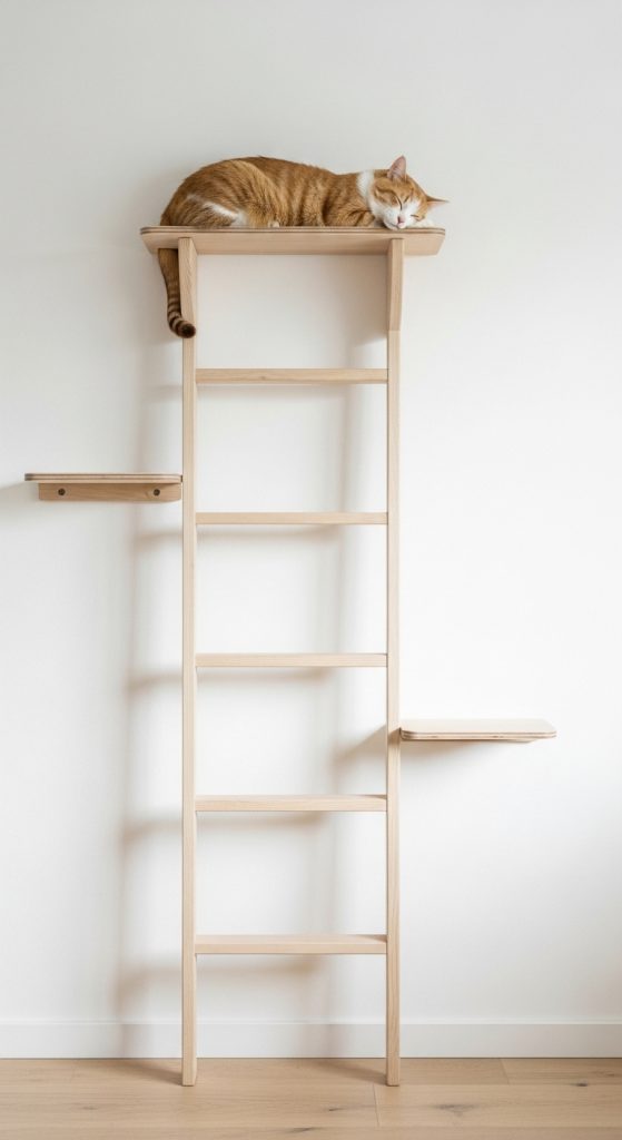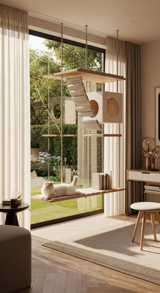For homes with high ceilings or narrow rooms, a vertical cat shelf tower is ideal. Think of it as a “bookshelf for cats” — tall and full of levels. Great for corners that typically go unused.
