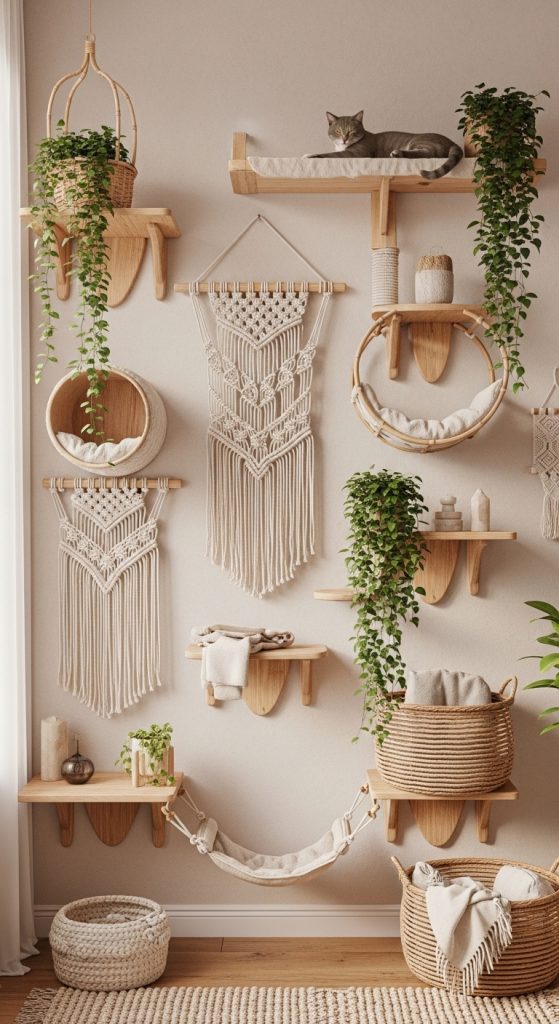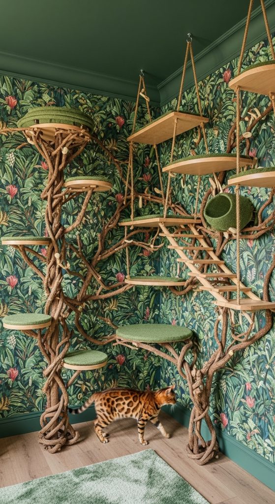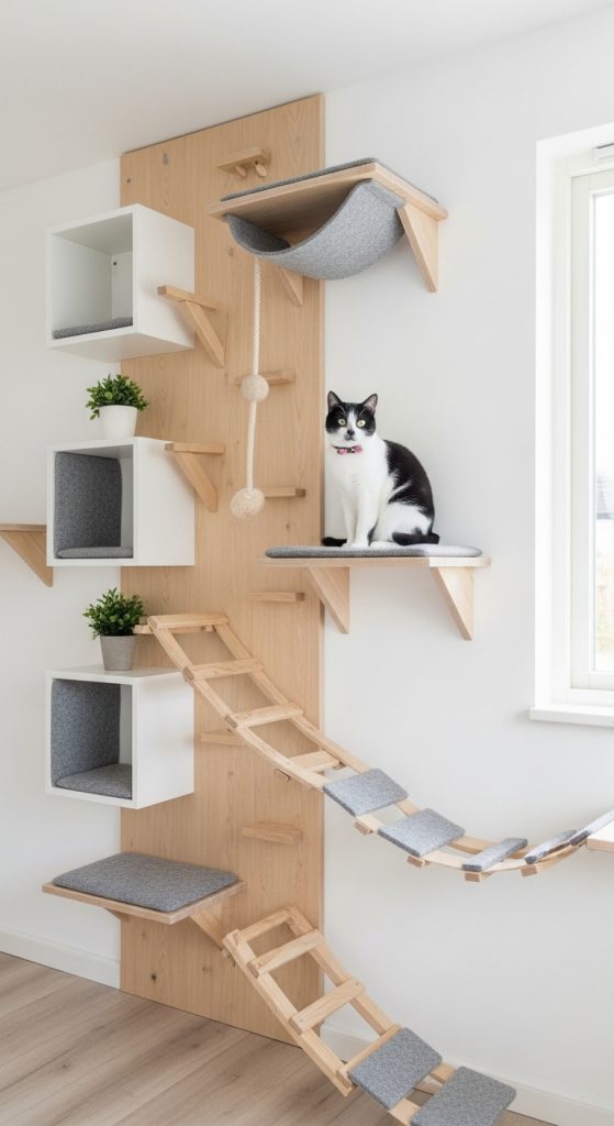 Go vertical with a climbing wall that includes staggered shelves, fabric tunnels, sisal-wrapped poles, and rope ladders. Perfect for high-energy cats, this setup turns your wall into an amusement park.