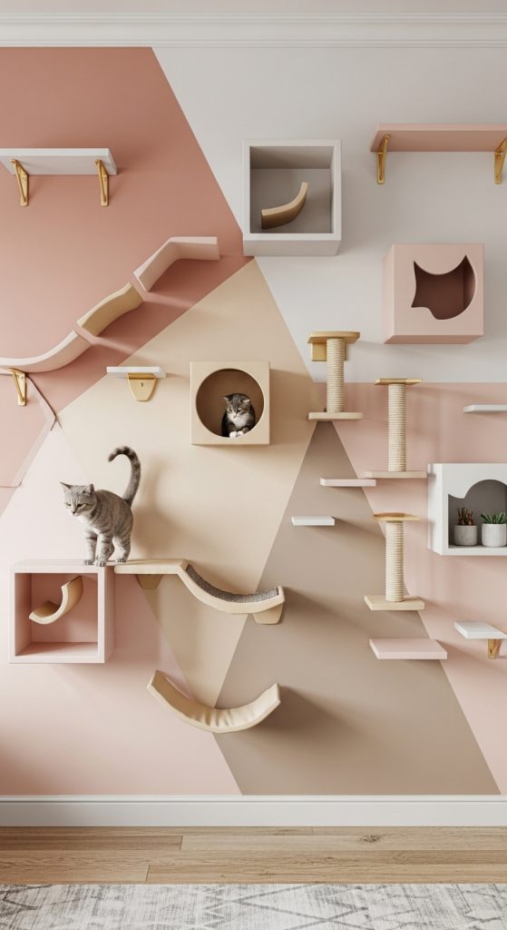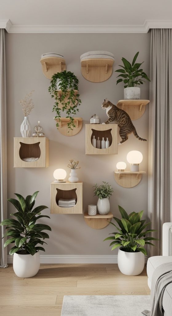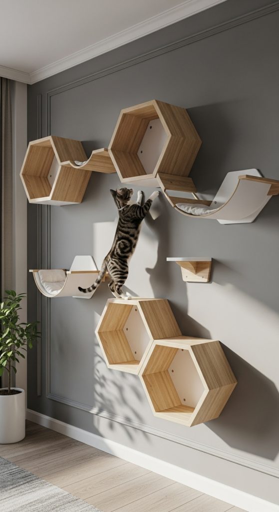 Geometric wall shelves — particularly hexagons or cubes — create beautiful patterns while giving cats cozy spaces to climb or hide. These shapes can be arranged in honeycomb-style layouts that double as art installations.