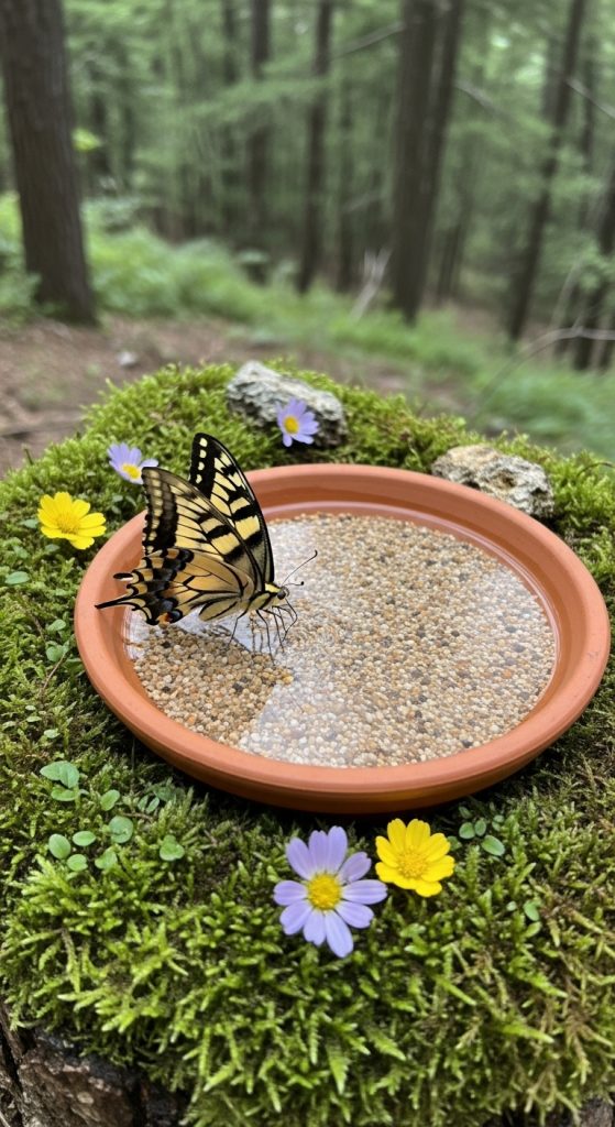 Butterflies need minerals from damp soil. Create a shallow puddling station using a terracotta saucer, sand, and water mixed with a pinch of salt.