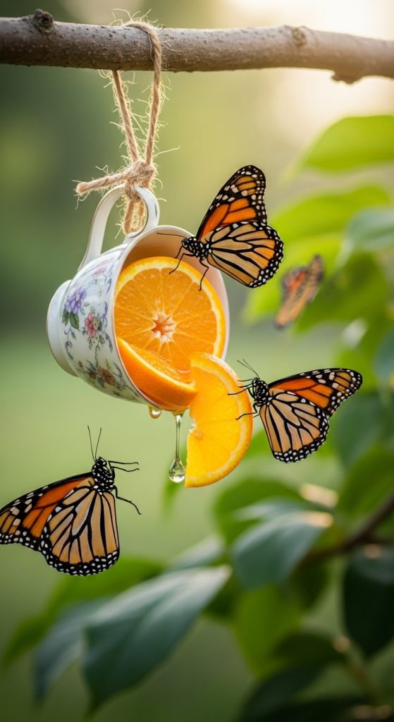 Turn an old saucer or teacup into a butterfly feeder. Fill it with overripe fruit slices or a sugar-water solution and hang it from a tree with twine.
