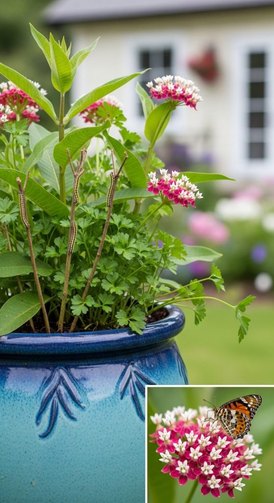 Craft a large planter filled with host and nectar plants specifically for butterflies. Add small sticks for caterpillars to climb.