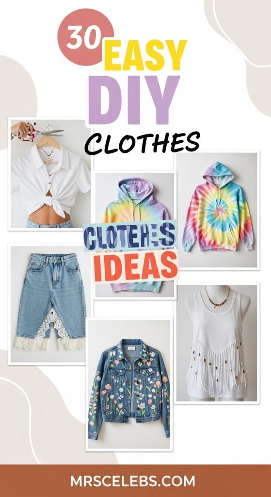 “Collage of 4 stunning DIY clothing items (like the sequin tee, embroidered shirt, scarf top, and tie-dye crop top) arranged in grid format. Each photo has dreamy lighting, clean composition, and overlaid text ’30+ Easy DIY Clothes Ideas’ in a modern brush font with watercolor effects.”