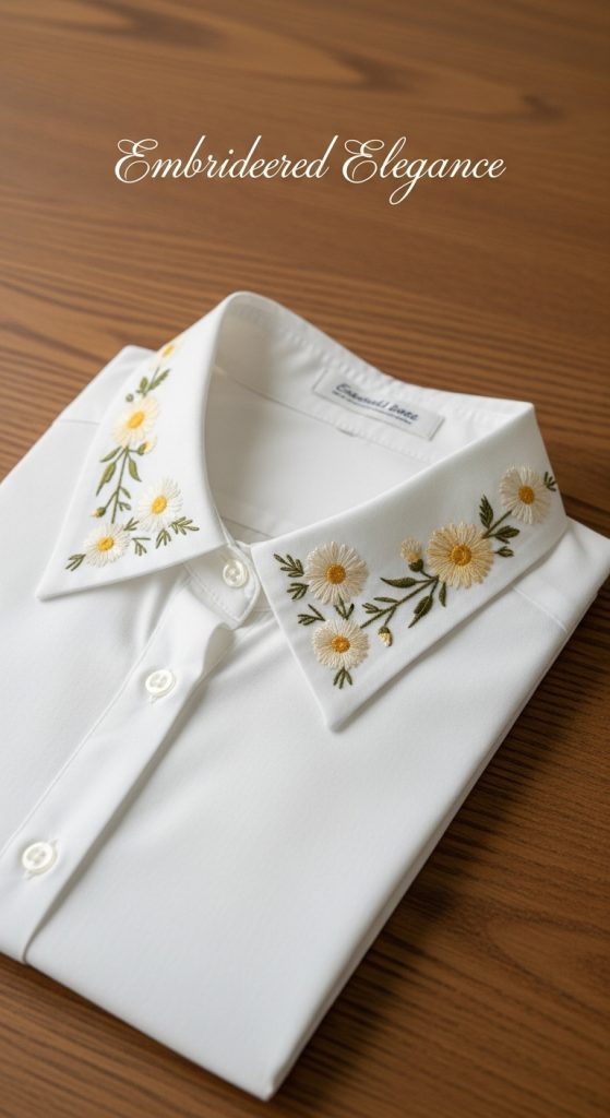 Add floral or geometric embroidery to the collars of basic button-up shirts for an elegant touch.