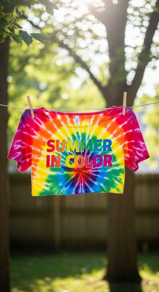 Make your own summer tie-dye crop tops with vibrant colors. Spiral, heart, or scrunch – the patterns are endless!
