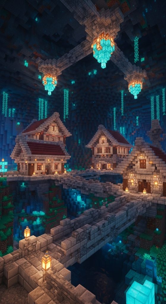 Suspend platforms in the sky using chains, vines, or beams of light. Each floating island has a unique building—library, forge, greenhouse—connected by bridges or teleport pads. Use end rods, amethyst, and glass.