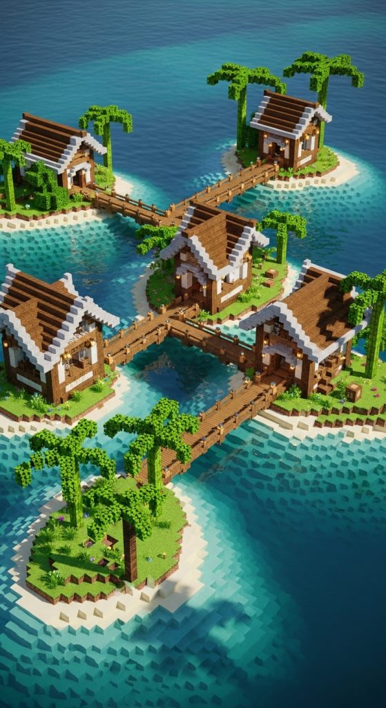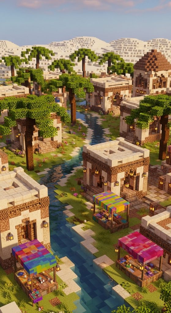Surround your village with palm trees, sandstone walls, and an artificial oasis with waterfalls. Build using terracotta, smooth sandstone, and acacia wood. Include market stalls and spice-themed color palettes.