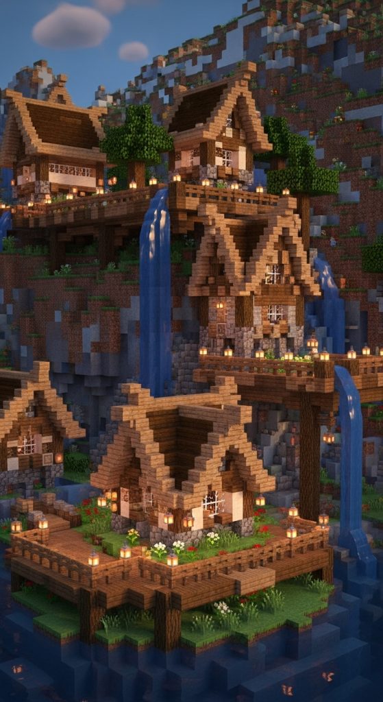 Build the village vertically on a hill or cliff. Create terraced layers, each containing 2–3 houses, with stone stairs or rope bridges connecting them. Use retaining walls, lush gardens, and waterfalls for detail.