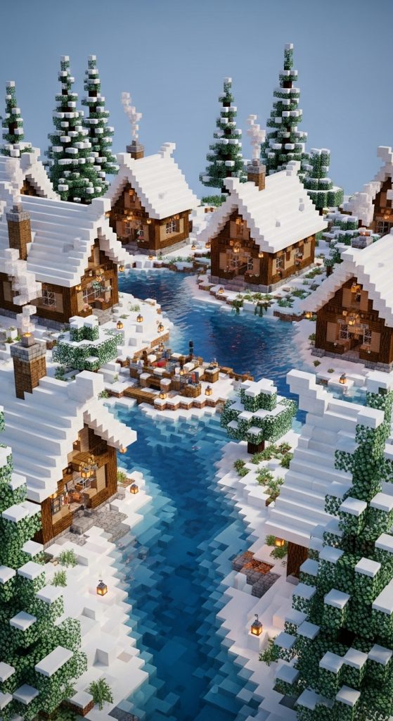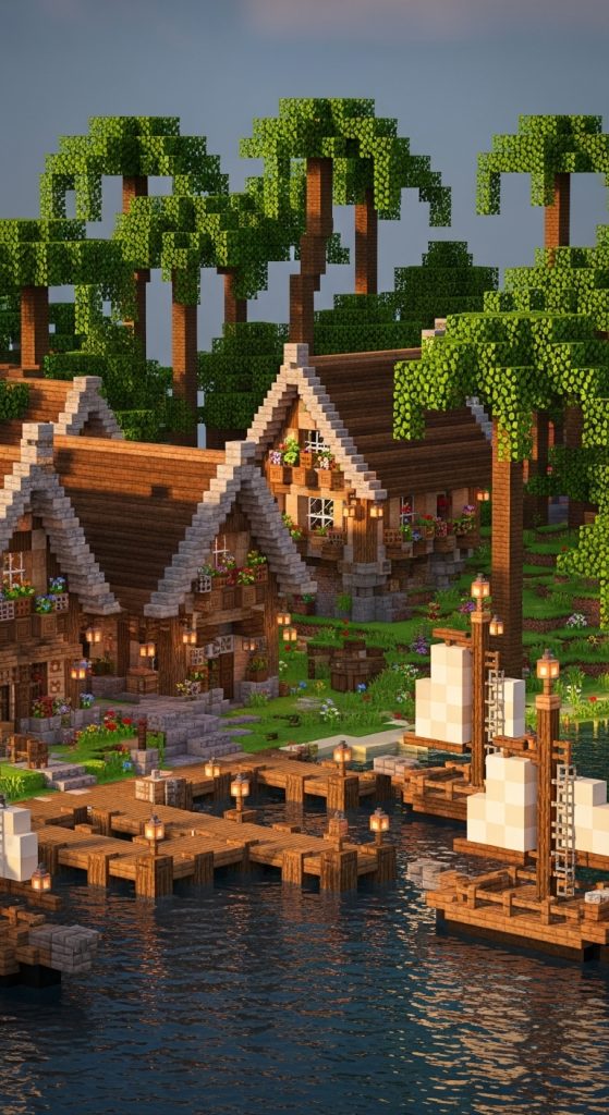 Place your village along the edge of a river or lake. Use docks, boats, and bridges to create an interconnected water-based community. Include fishing huts, boathouses, and even floating homes.
